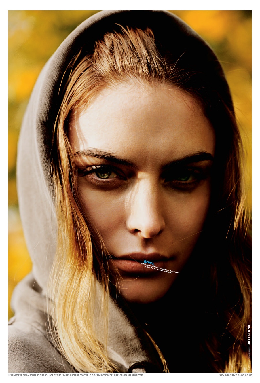 Affiche de lutte contre la discrimination des personnes séropositives. Le visuel incite le spectateur à se rapprocher d'un visage (ici une jeune femme à capuche) pris en gros plan afin de pouvoir...