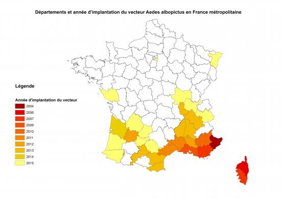 Liste des départements avec implantation d’Aedes albopictus : Ain, Aisne, Alpes-de-Haute-Provence, Alpes-Maritimes, Hautes-Alpes, Ardèche, Ariège, Aude, Aveyron, Bouches-du-Rhône, Corrèze, Corse-du-Sud, Haute-Corse, Dordogne, Drôme, Gard, Haute-Garonne, Gers, Gironde, Hérault, Indre, Isère, Landes, Lot, Lot-et-Garonne, Lozère, Maine et Loire, Pyrénées-Atlantiques, Hautes Pyrénées, Pyrénées-Orientales, Bas-Rhin, Haut-Rhin Rhône, Saône-et-Loire, Savoie, Tarn, Tarn-et-Garonne, Var, Vaucluse, Vendée, Hauts de Seine, Val-de-Marne.