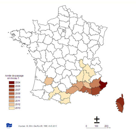 Du 1er mai 2013 au 30 novembre 2013, dans les 17 départements du sud de la France sous surveillance renforcée :