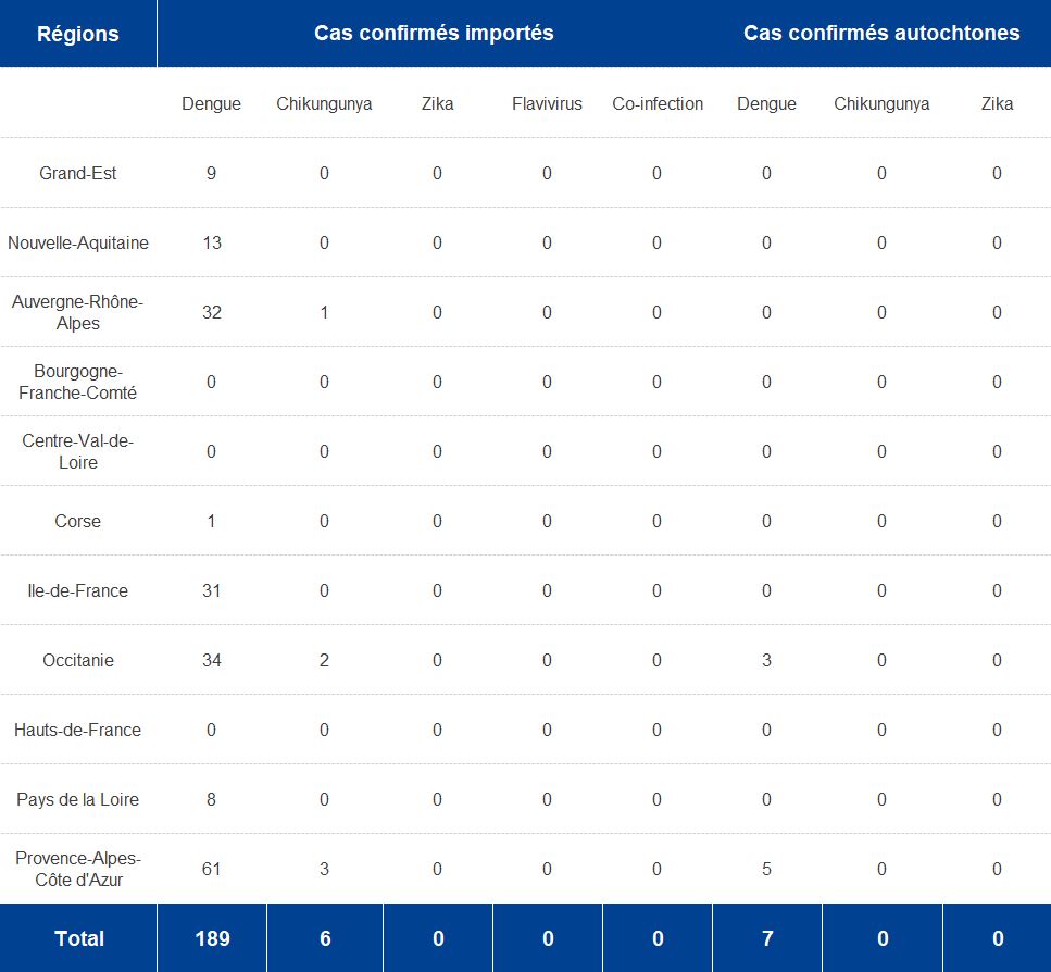 • 4 cas autochtones de dengue ont été confirmés par le Centre National de Référence (CNR) des arbovirus en région Provence-Alpes-Côte d’Azur. Les 2 premiers, confirmés les 20 août et 11 septembre sont survenus dans le département du Var. Ils ne sont pas liés car de sérotype différents (sérotype 1 et sérotype 2). Les 3ème et 4ème cas, confirmés les 18 septembre et 3 octobre dans le département des Bouches du Rhône sont liés et constituent un foyer. Les 2 patients résident dans le même voisinage et ont le même sérotype de dengue : sérotype 2. Ils ne sont pas liés aux cas du Var.